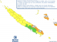 Il existe un risque qu'à Maré, Lifou, et sur le Sud-Est, les pluies s'intensifient en cours de nuit. Sur Ouvéa, le reste de la côte Est, les extrêmes Nord et Sud, et la côte Ouest au nord de Bourail, on prévoit des averses fortes ou orageuses.